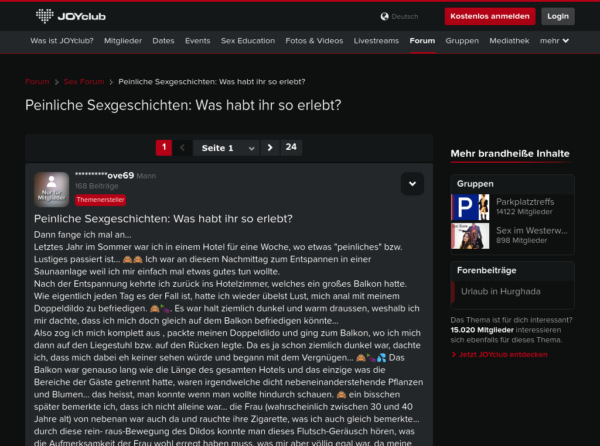 Das Forum „Peinliche Sexgeschichten – Was habt ihr so erlebt?“ auf der Website www.joyclub.de ist ein Ort, an dem Mitglieder ihre lustigen, verrückten und manchmal auch unangenehmen sexuellen Erlebnisse miteinander teilen können. Die Geschichten reichen von peinlichen Missgeschicken im Bett bis hin zu unerwarteten Begegnungen, die für viele Lacher sorgen.